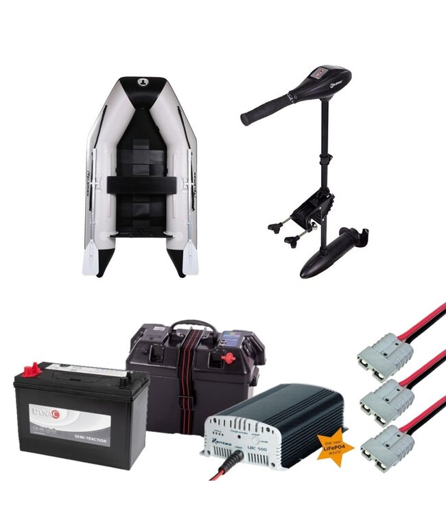 Deze complete set bestaat uit een rubberboot met elektrische buitenboordmotor en de juiste benodigdheden om meteen te kunnen varen. Door deze set aan te schaffen weet je zeker dat er niks wordt vergeten, zo kun je optimaal genieten op het water. Wij hebben bij deze set voor een 105 Ah accu gekozen om lekker een aantal uren te kunnen varen. Daarnaast ontvang je ook een accubak waar de accu in past, een volautomatische lader die zeer geschikt is voor de accu en een aansluit set zodat het aansluiten van de accu met motor of oplader nooit fout kan gaan. Deze set is dus heel kindvriendelijk.