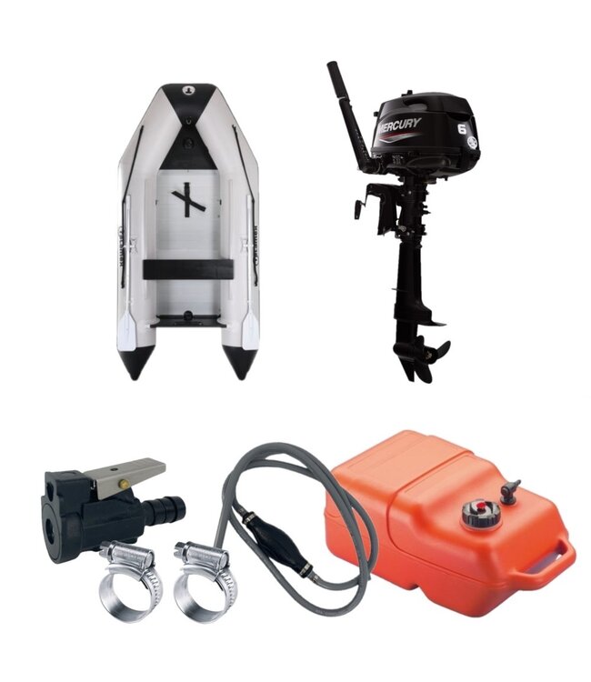 Deze complete set bestaat uit een rubberboot met 4-takt buitenboordmotor van het merk Mercury en de juiste benodigdheden om meteen te kunnen varen. Door deze set aan te schaffen weet je zeker dat er niks wordt vergeten, zo kun je optimaal genieten op het water. Omdat er op een 6 pk een externe tank aangesloten kan worden, hebben wij bij deze set voor een 12 liter externe brandstoftank gekozen. Daarbij zit er ook nog een brandstofslang met brandstofadapter en slangklemmen in het pakket. Met deze externe tank kun je makkelijk een hele dag zonder zorgen varen.